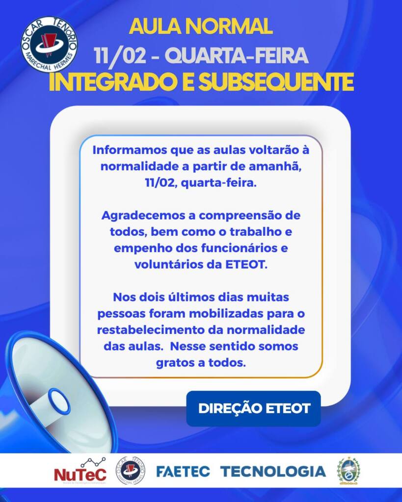 A ETEOT informa que as aulas do período letivo 2026 terão início no dia 09…
