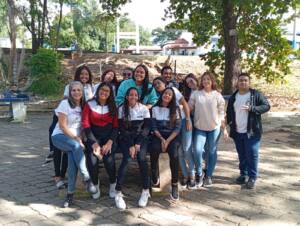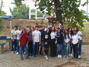 Durante a caminhada, os alunos tiveram uma agradável surpresa ao encontrarem um grupo do curso de Eletrônica do Mauá, acompanhado da professora Maria José, que compartilhou com os estudantes a história do reflorestamento das mangueiras e da plantação de novas mudas, como pitangueiras e amoreiras, que hoje embelezam a entrada da ETEOT. 🌳