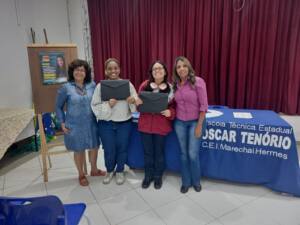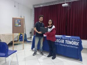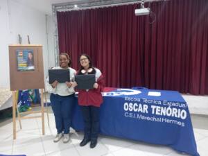 A cerimônia de entrega dos prêmios ocorreu nesta quinta-feira, dia 07 de novembro, no auditório da ETEOT, com a presença do diretor técnico da ETEOT Rodolfo Paolucci, da orientadora Márcia, da supervisora Ana Cristina, de representantes do Grêmio Estudantil e de amigos das alunas.