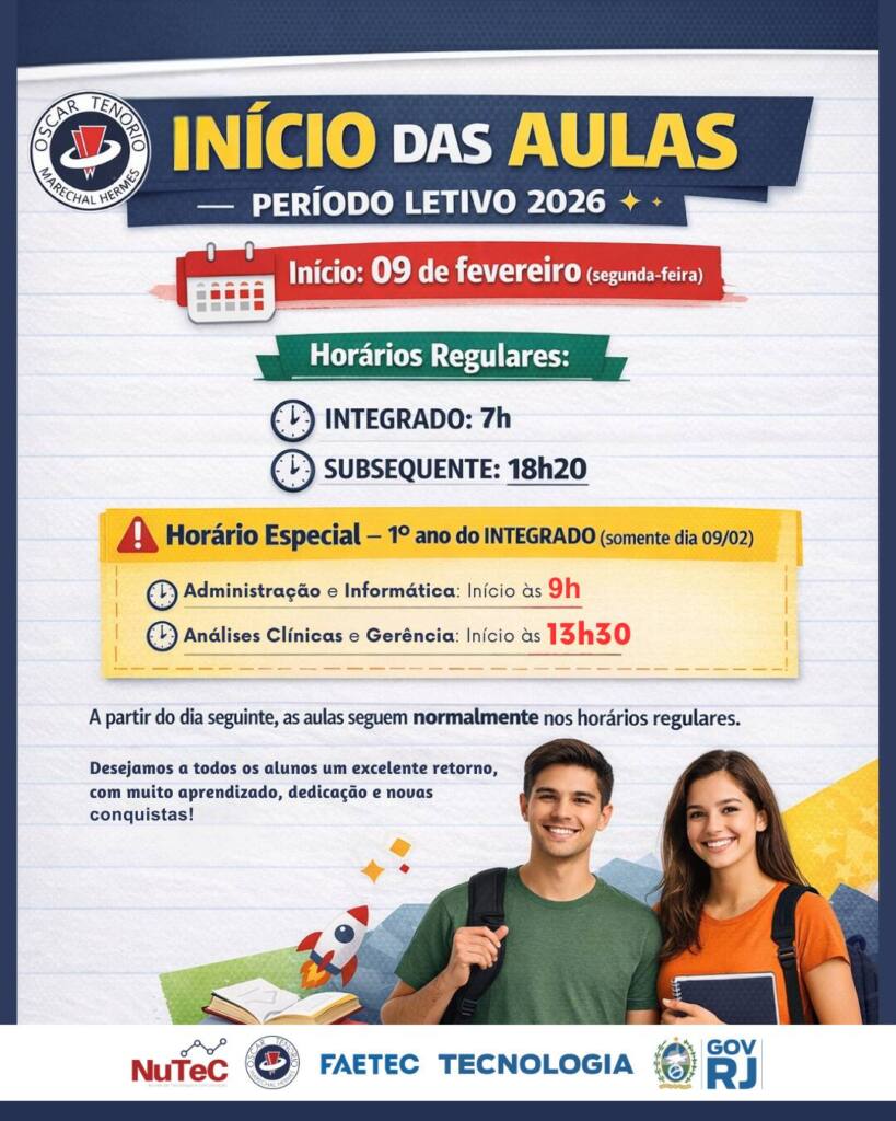 A ETEOT informa que as aulas do período letivo 2026 terão início no dia 09 de fevereiro (segunda-feira), conforme os horários abaixo: