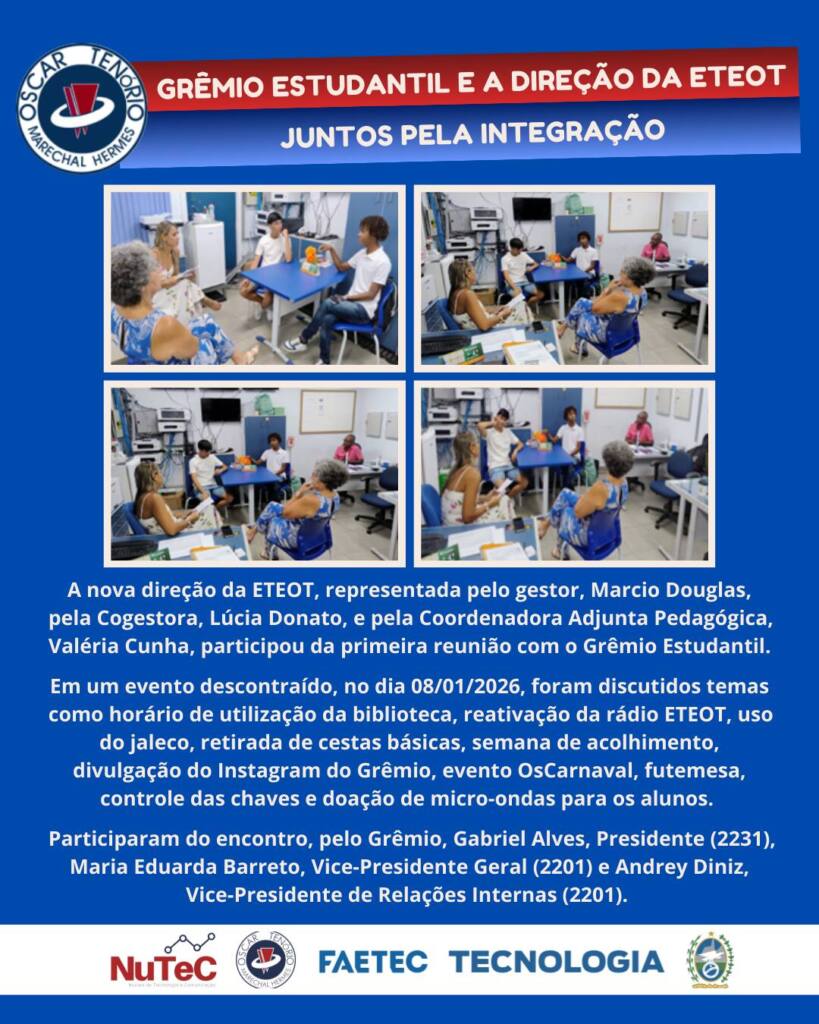 A nova direção da ETEOT, representada pelo gestor, Marcio Douglas, pela Cogestora, Lúcia Donato, e pela Coordenadora Adjunta Pedagógica, Valéria Cunha, participou da primeira reunião com o Grêmio Estudantil. Em um evento descontraído, no dia 08/01/2026, foram discutidos temas como horário de utilização da biblioteca, reativação da rádio ETEOT, uso do jaleco, retirada de cestas básicas, semana de acolhimento, divulgação do Instagram do Grêmio, evento OsCarnaval, futemesa, controle das chaves e doação de micro-ondas para os alunos. Participaram do encontro, pelo Grêmio, Gabriel Alves, Presidente (2231), Maria Eduarda Barreto, Vice-Presidente Geral (2201) e Andrey Diniz, Vice-Presidente de Relações Internas (2201).