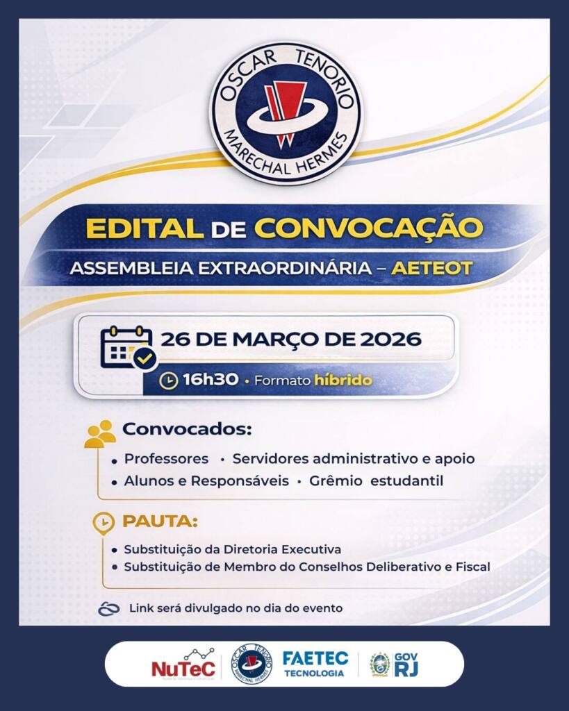 A Escola Técnica Estadual Oscar Tenório (ETEOT) torna público o Edital de Convocação para a Assembleia Extraordinária da Associação Escolar (AETEOT).