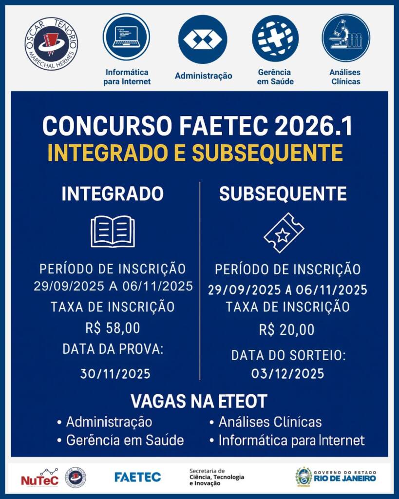 A Fundação de Apoio à Escola Técnica (FAETEC) abriu inscrições para o Processo Seletivo 2026.1, com vagas para cursos Técnicos de Nível Médio nas modalidades Integrado e Subsequente. Os processos são organizados pela COSEAC/UFF e abrangem escolas de toda a rede FAETEC.A ETE Oscar Tenório (ETEOT) oferece vagas em quatro cursos técnicos. 🧭 Modalidades de […]