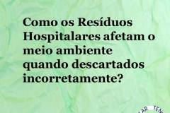 Resíduos Sólidos de Serviços de Saúde (RSSS), de acordo com a ANVISA são todos os resíduos gerados em serviços relacionados com o atendimento à saúde humana ou animal, e podemos notar que se não descartados corretamente, geram riscos a saúde pública e ao meio ambiente. Objetivo: conscientizar a população sobre o descarte correto dos RSS, diminuir a poluição da água e do solo, incentivar a criação de polos de descarte consciente e popularizar o assunto. Além de estar nos informando e consequentemente ajudando ao meio ambiente! E ai, ansiosos??